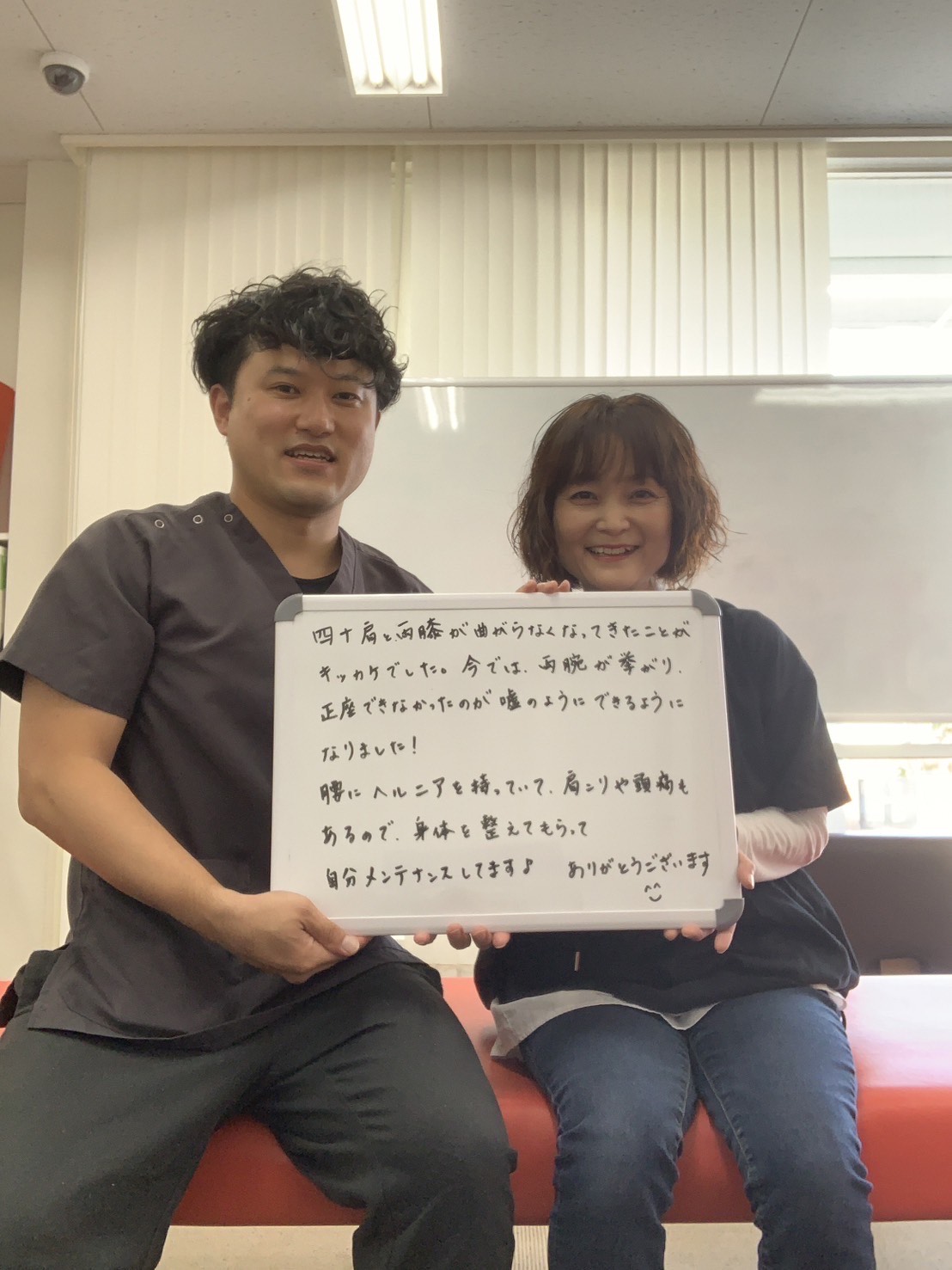 四十肩と両膝が曲がらなくなってきたことがキッカケでした。今では両腕が上がり、正座できなかったのが嘘のようにできるようになりました。腰にヘルニアを持っていて、肩こりや腰痛もあるので身体を整えてもらって自分メンテナンスしてます♪ありがとうございます!