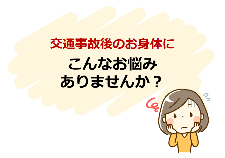 事故当日は歩いて帰れる程なんともなかったのに数日後から、体が重くだるくなってきて・・・という話をよく聞きます。受傷後3日以内に受診することをおすすめします。